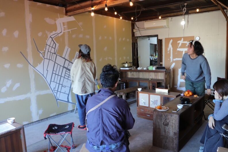 先月大分県佐伯市にて製作した作品です。会場の壁に周辺の地図が描いてあります。